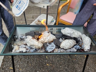 焼き芋を食べながら 火を囲んで お話に花が咲きます