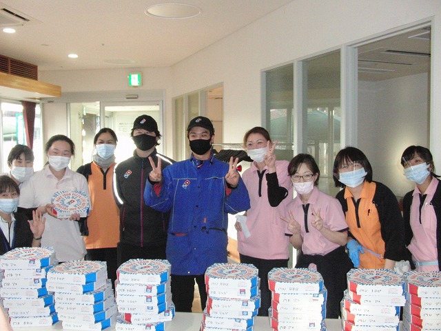 ドミノ・ピザ様では新型コロナウィルスの影響で困難な状況が続く中、地域社会を支えている方々に向けた支援活動として「無料ピザで地域支援」を実施されており、本日、当施設にもピザを支援していただきました。